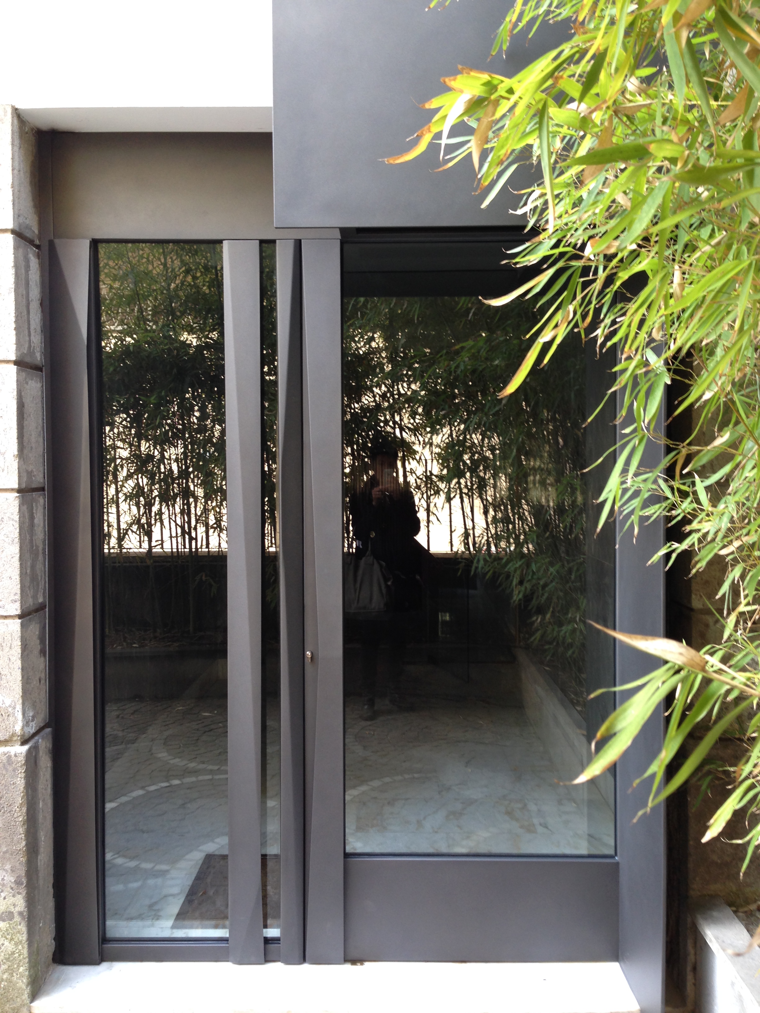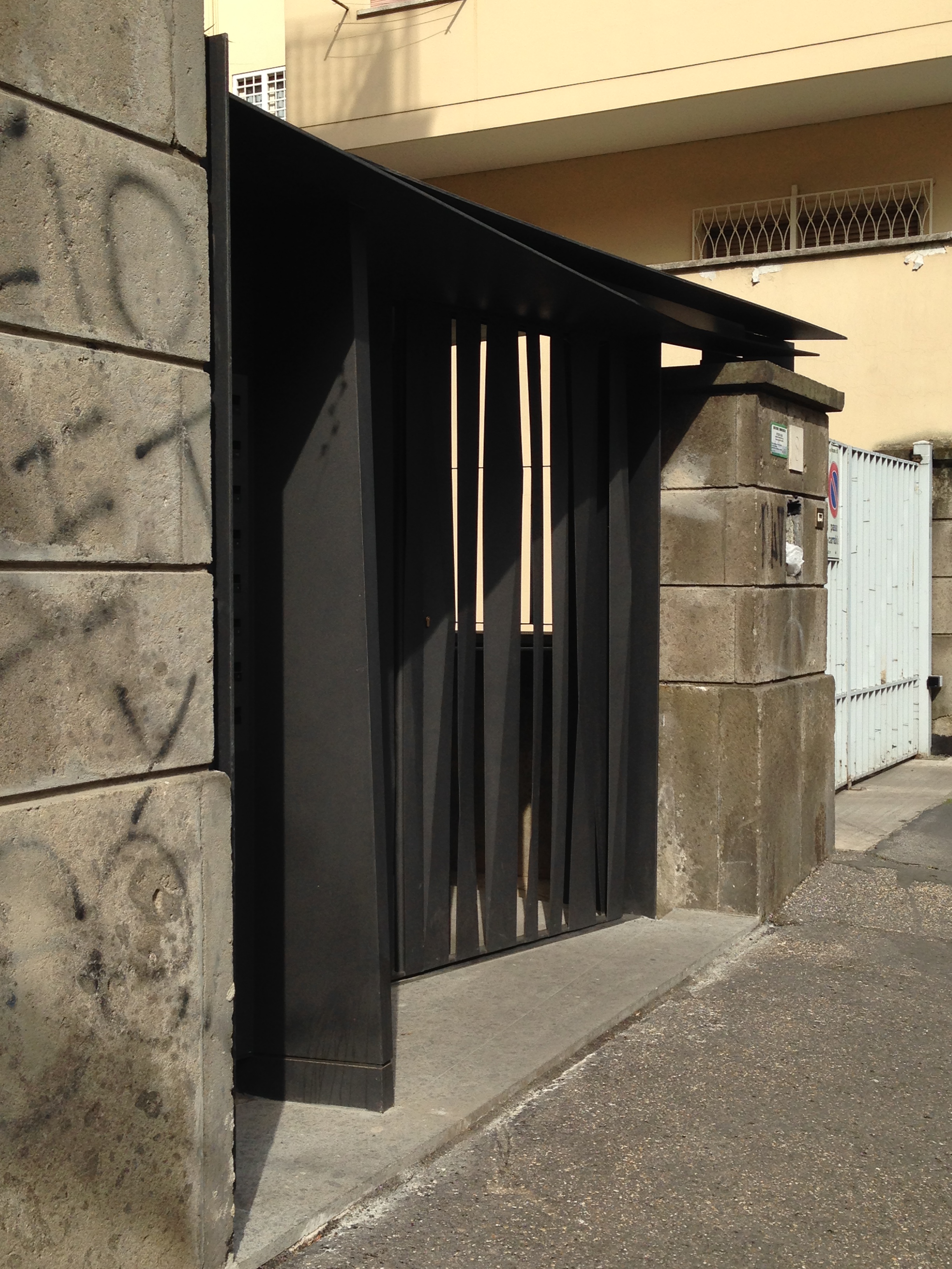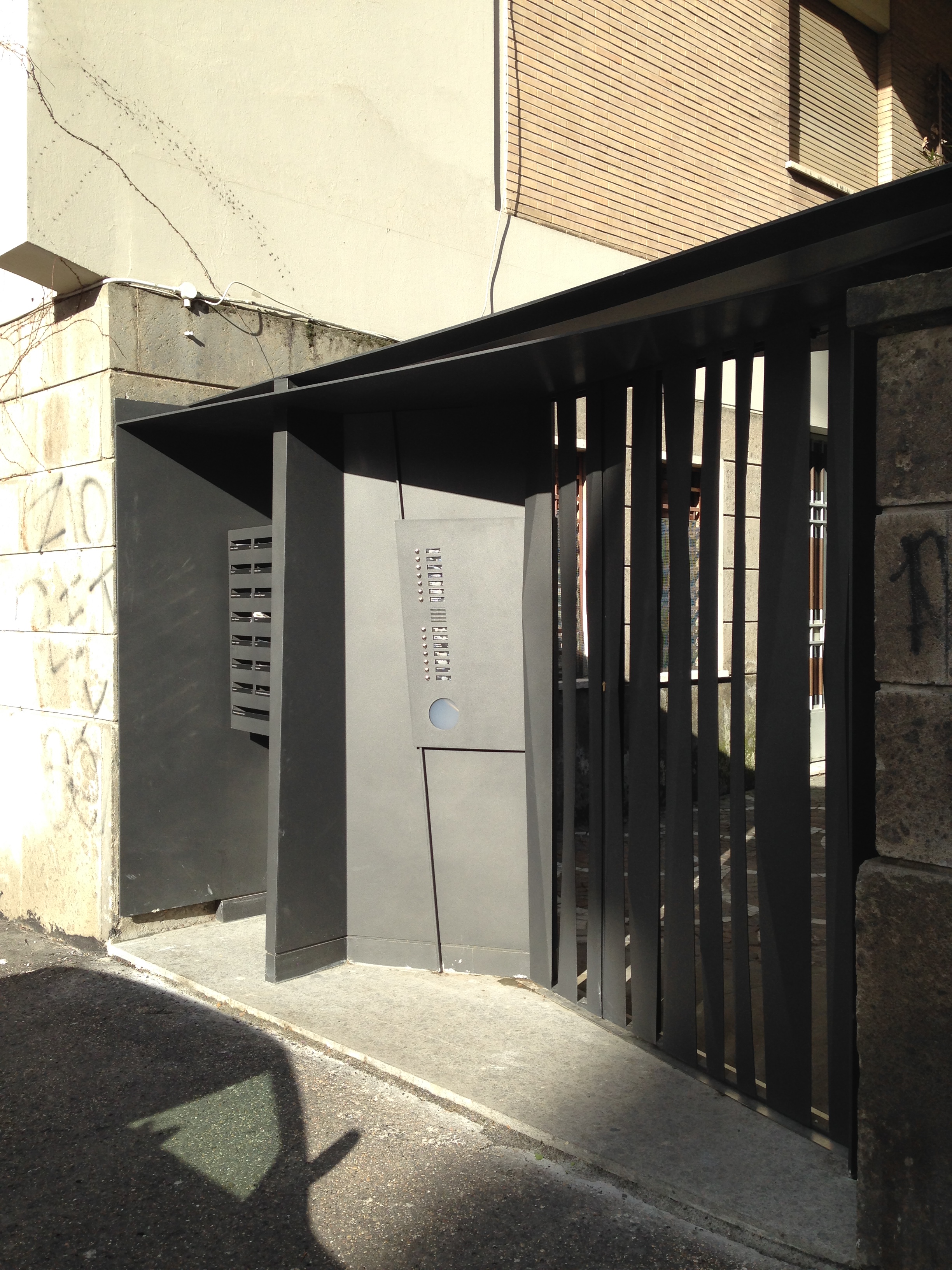 Movimento, scorci e continuità, interpenetrazione, tra dentro e fuori sono gli spunti progettuali per un cancello di recinzione ed un portone d’ingresso alla palazzina. Oltre il cancello vedo il bamboo, oltre il portone le superfici rivestite di pietra…