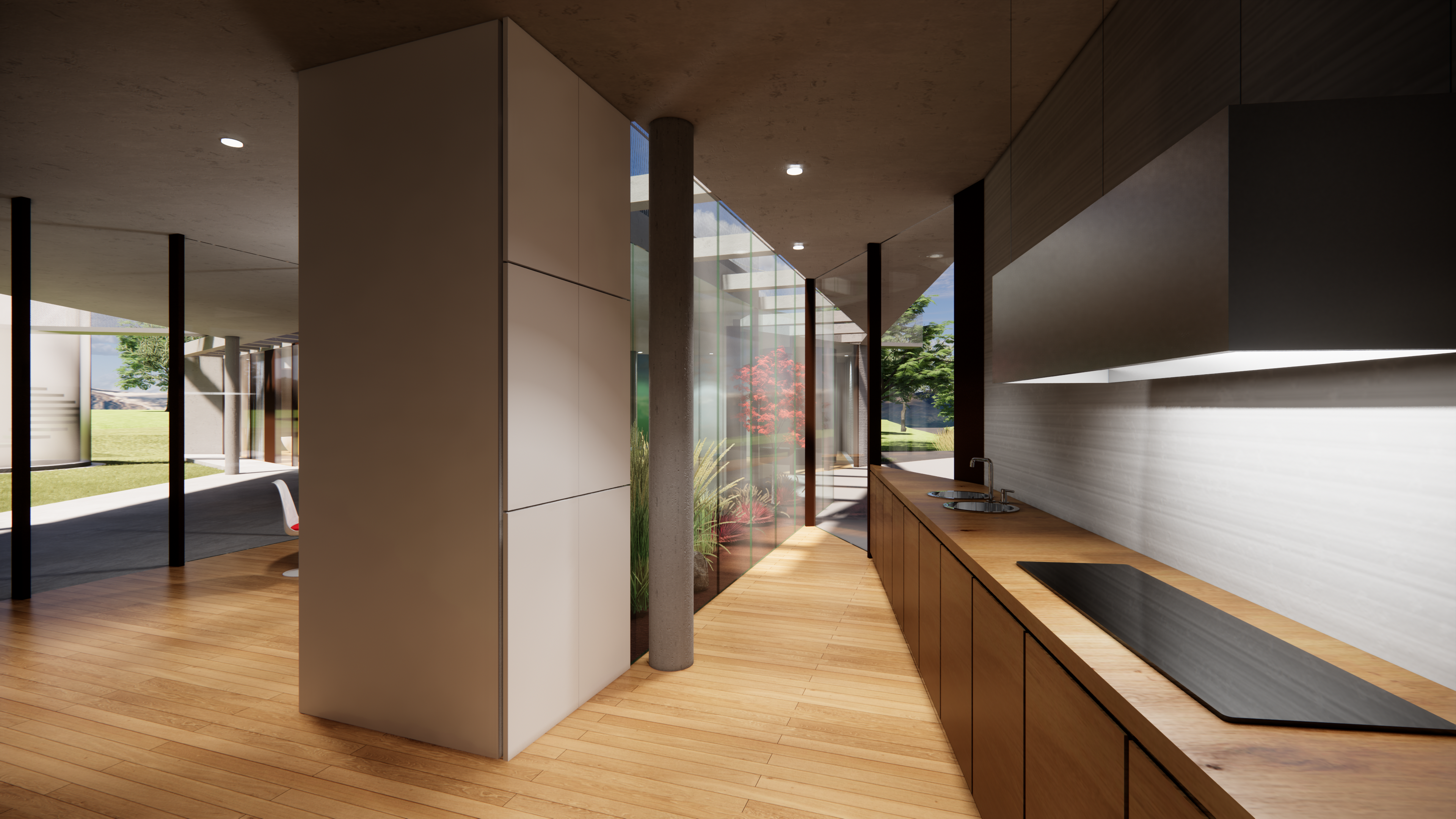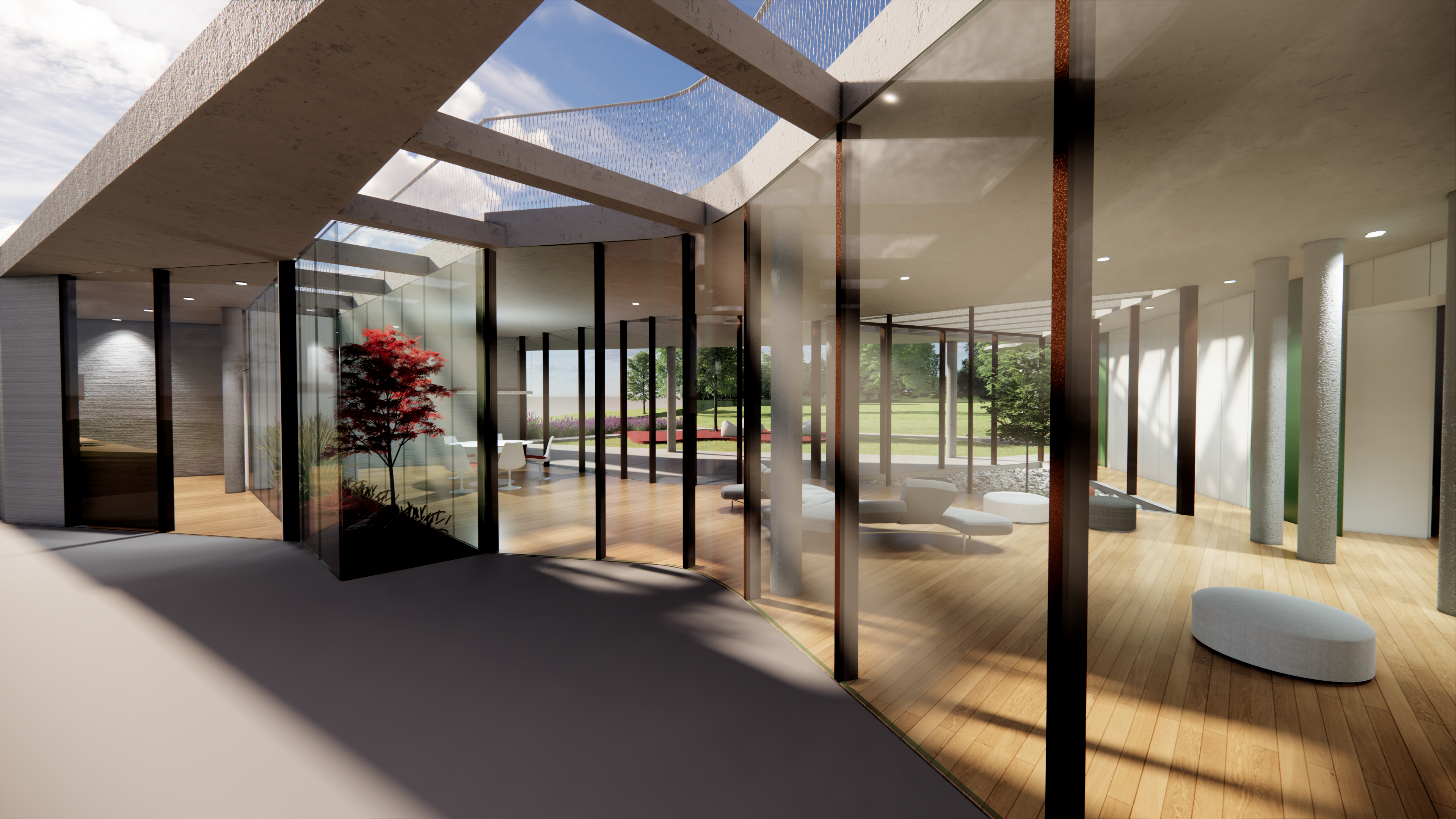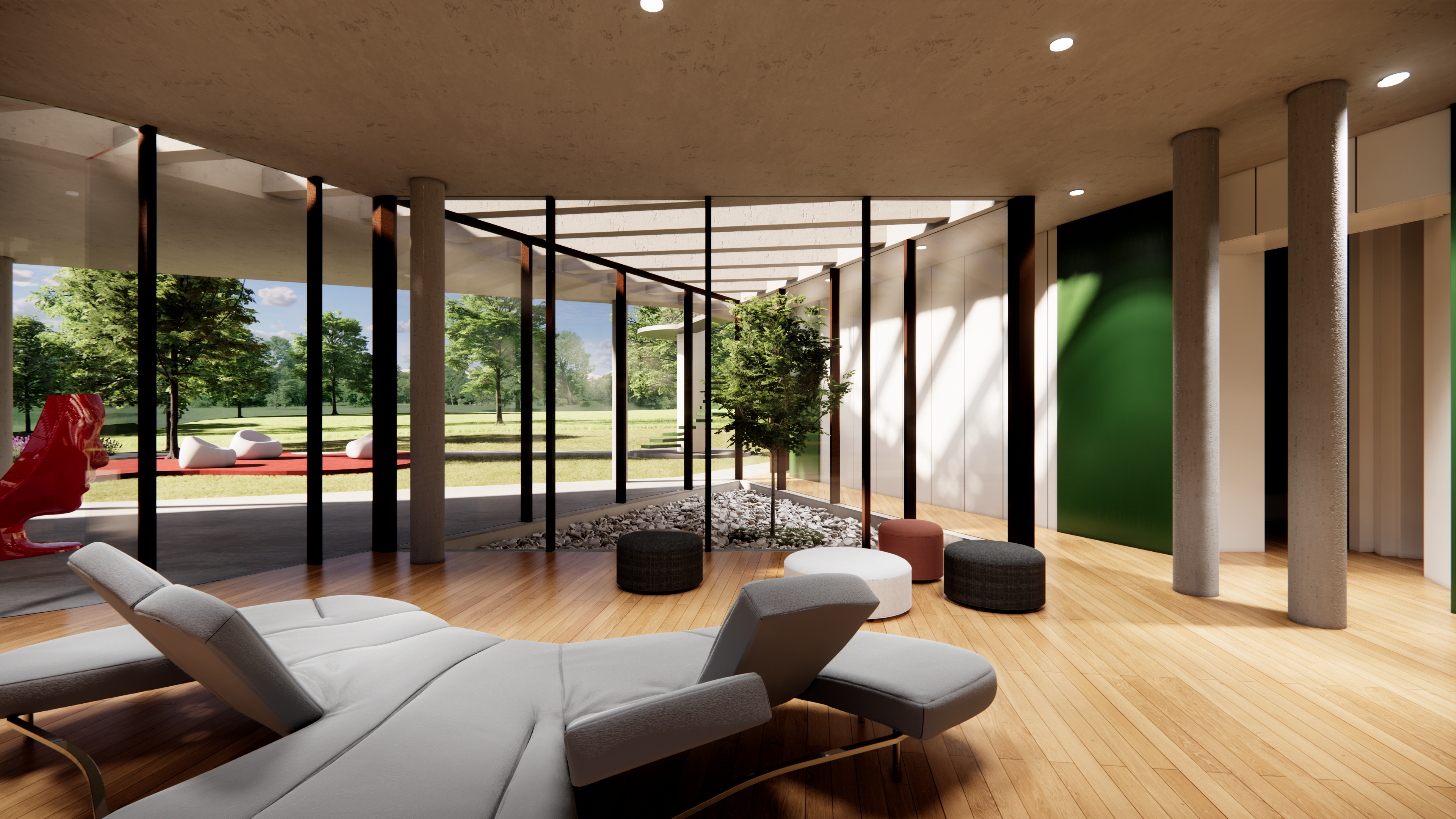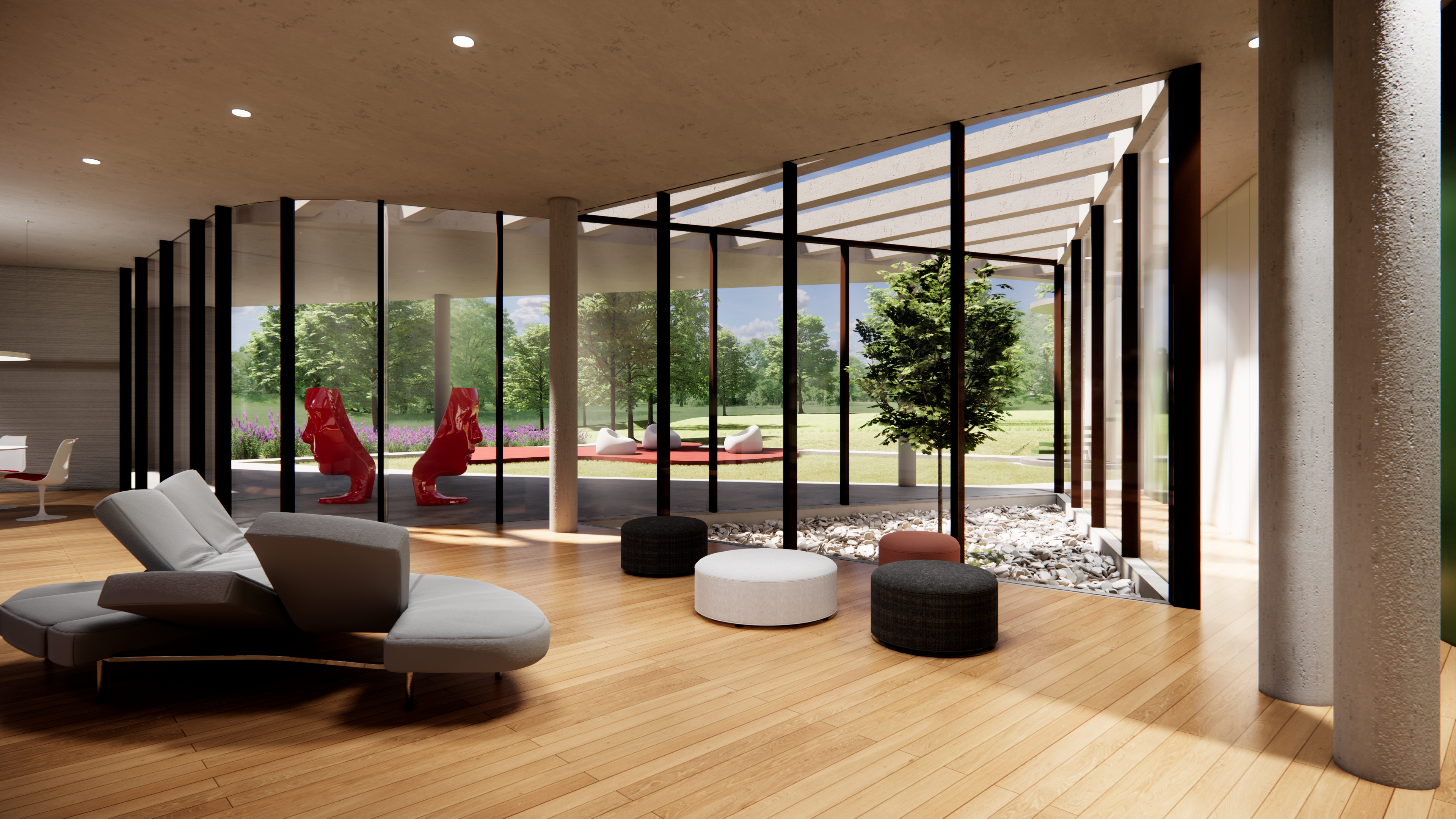 ◦ Quest’ultima, cuore del progetto, vive tra due curve sfalsate, vetrate, che comprimono lo spazio interno per dilatarlo ora verso il paesaggio ora verso il giardino privato della casa.