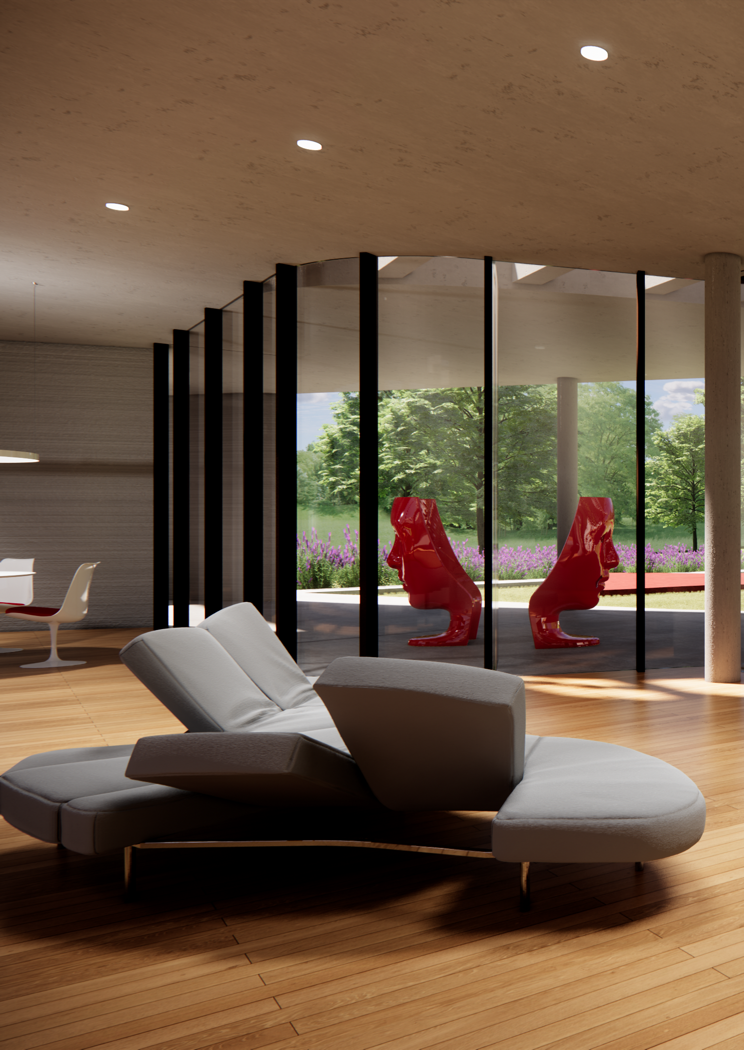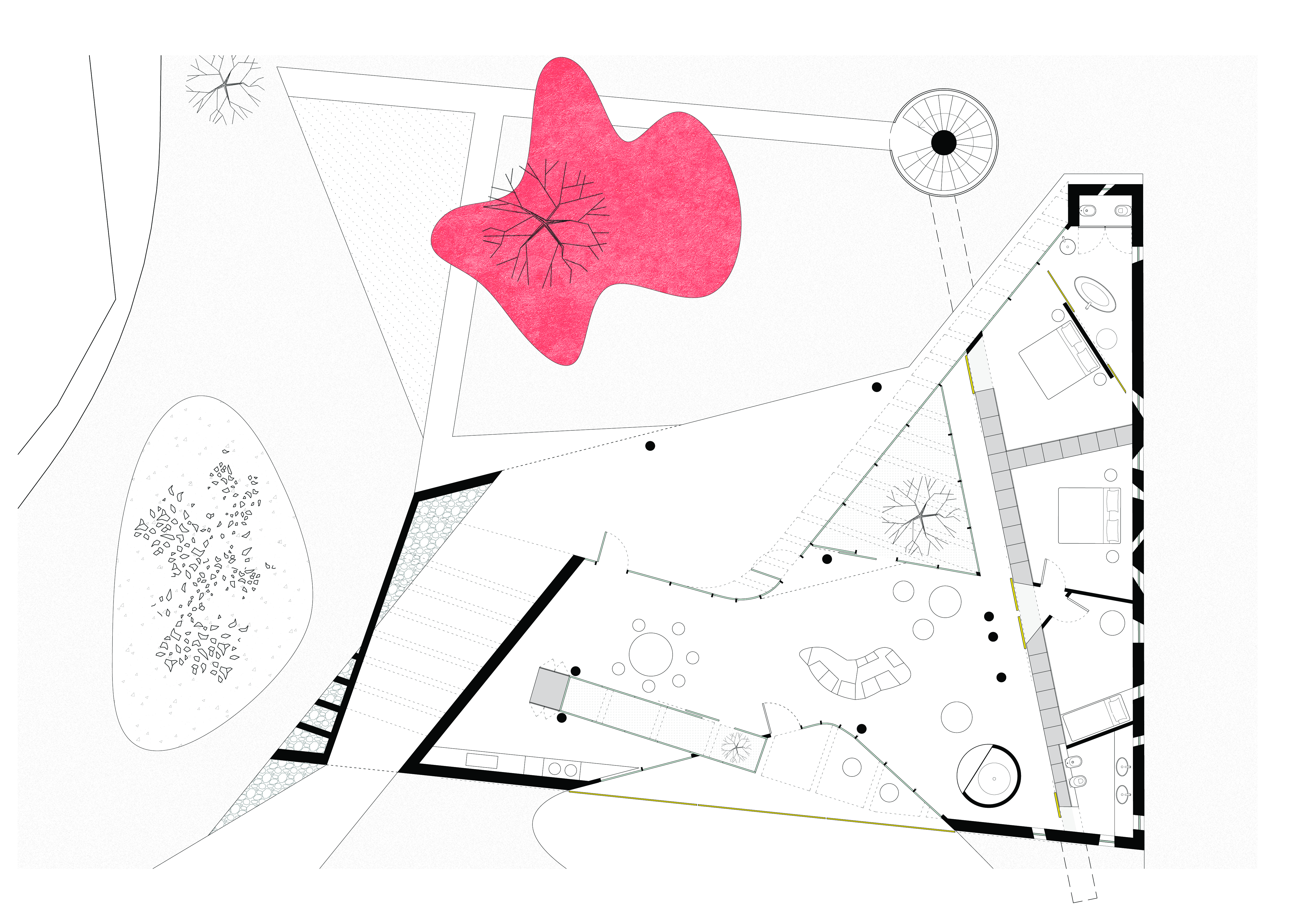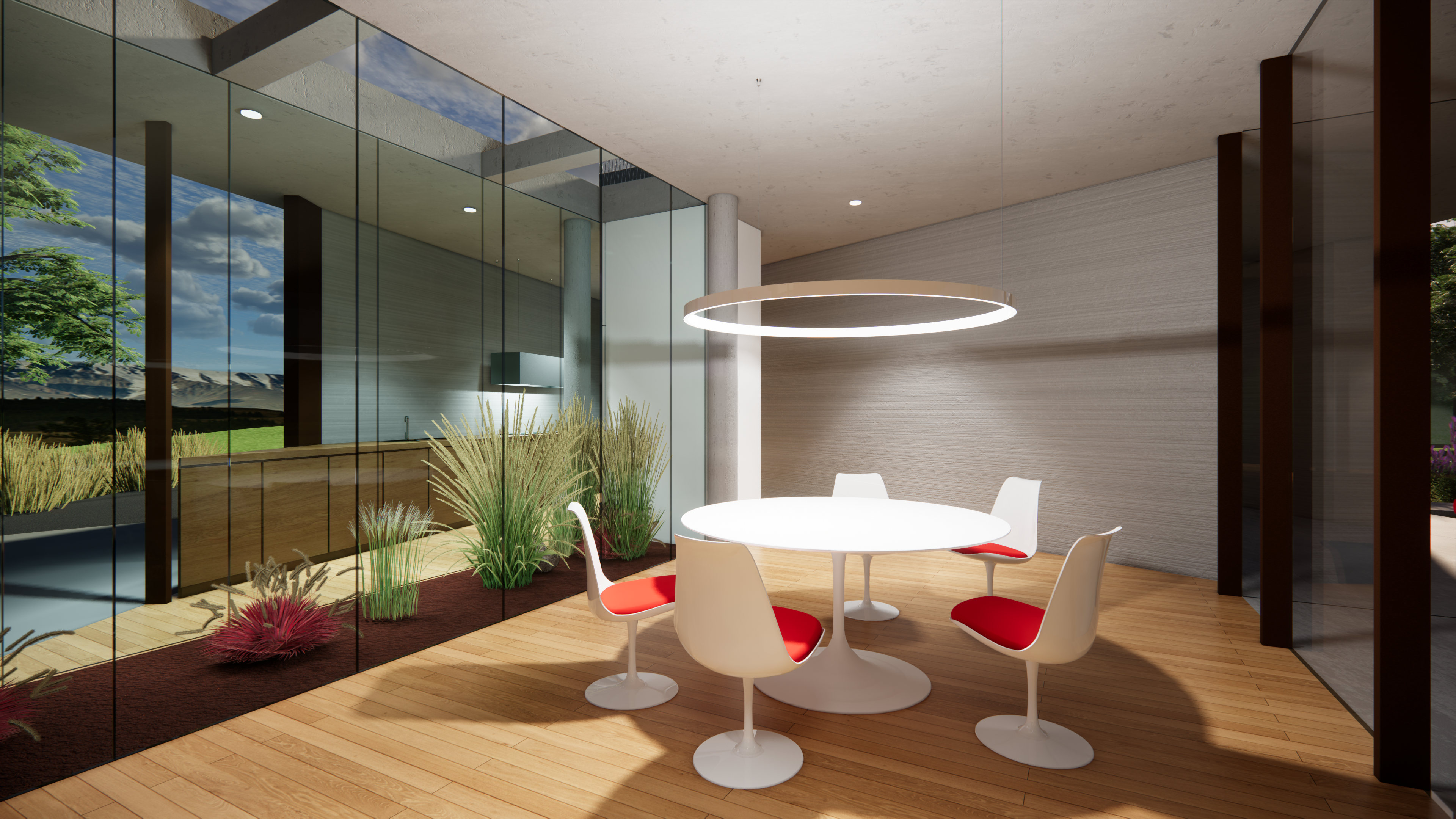 ◦ Quest’ultima, cuore del progetto, vive tra due curve sfalsate, vetrate, che comprimono lo spazio interno per dilatarlo ora verso il paesaggio ora verso il giardino privato della casa.