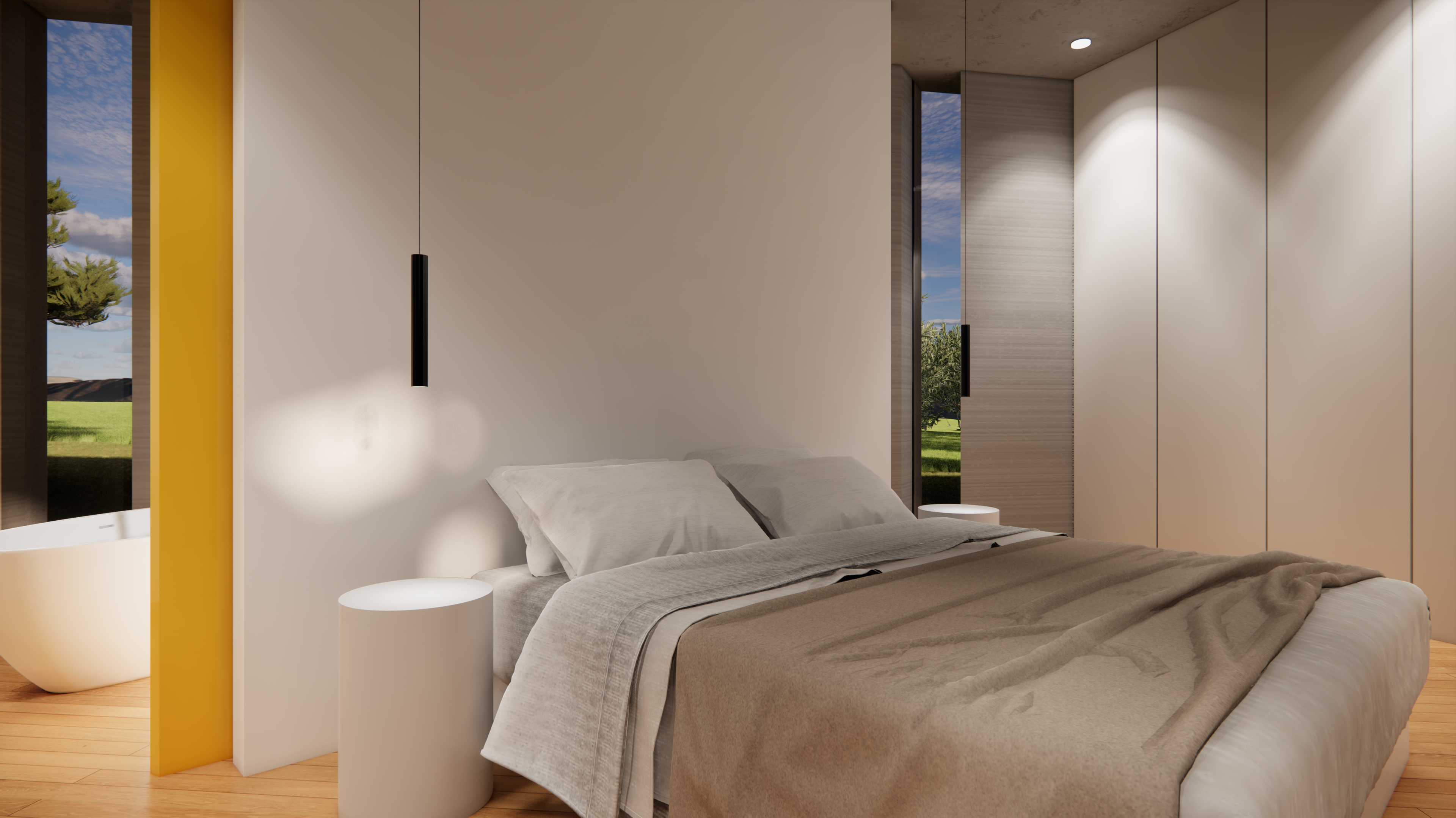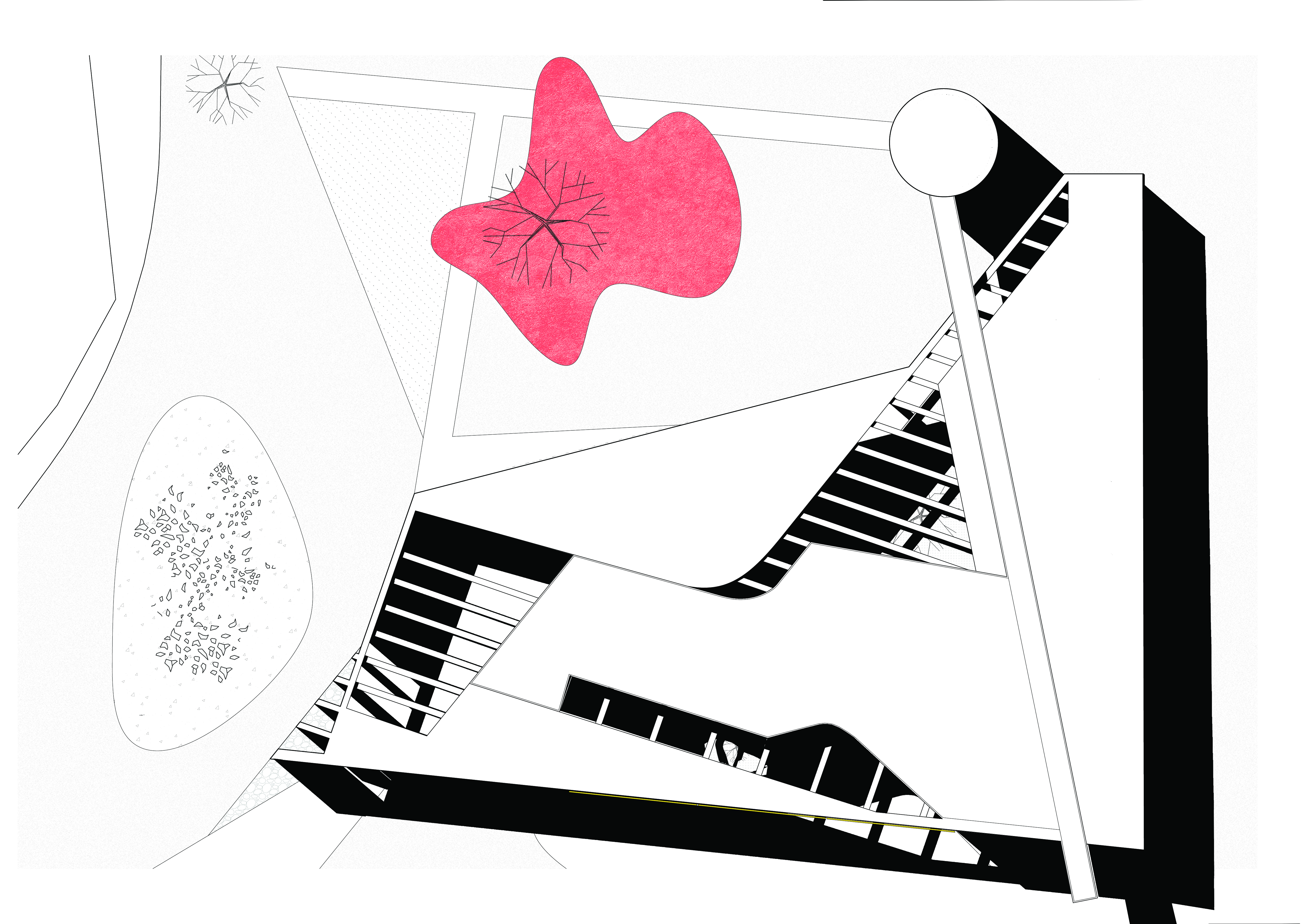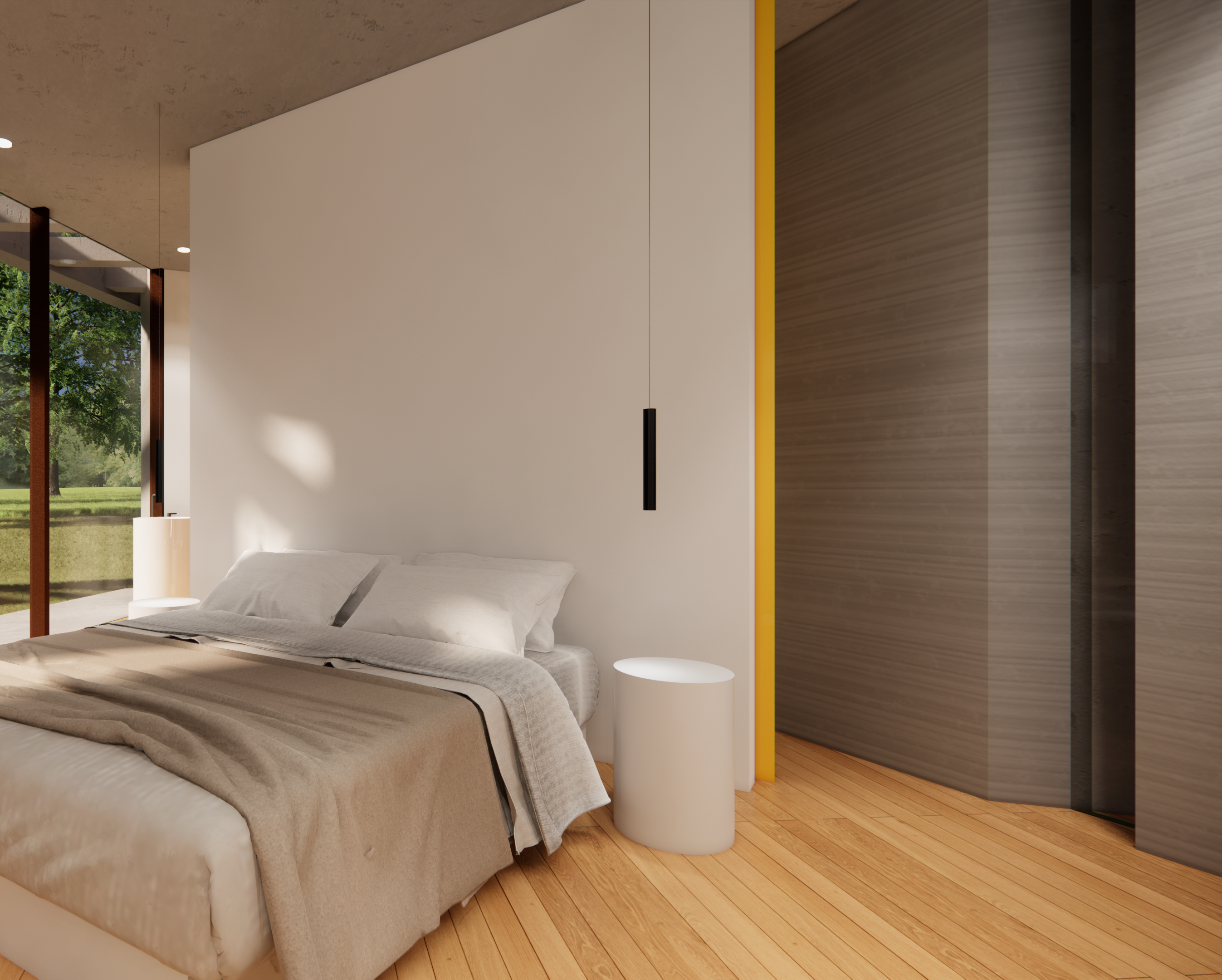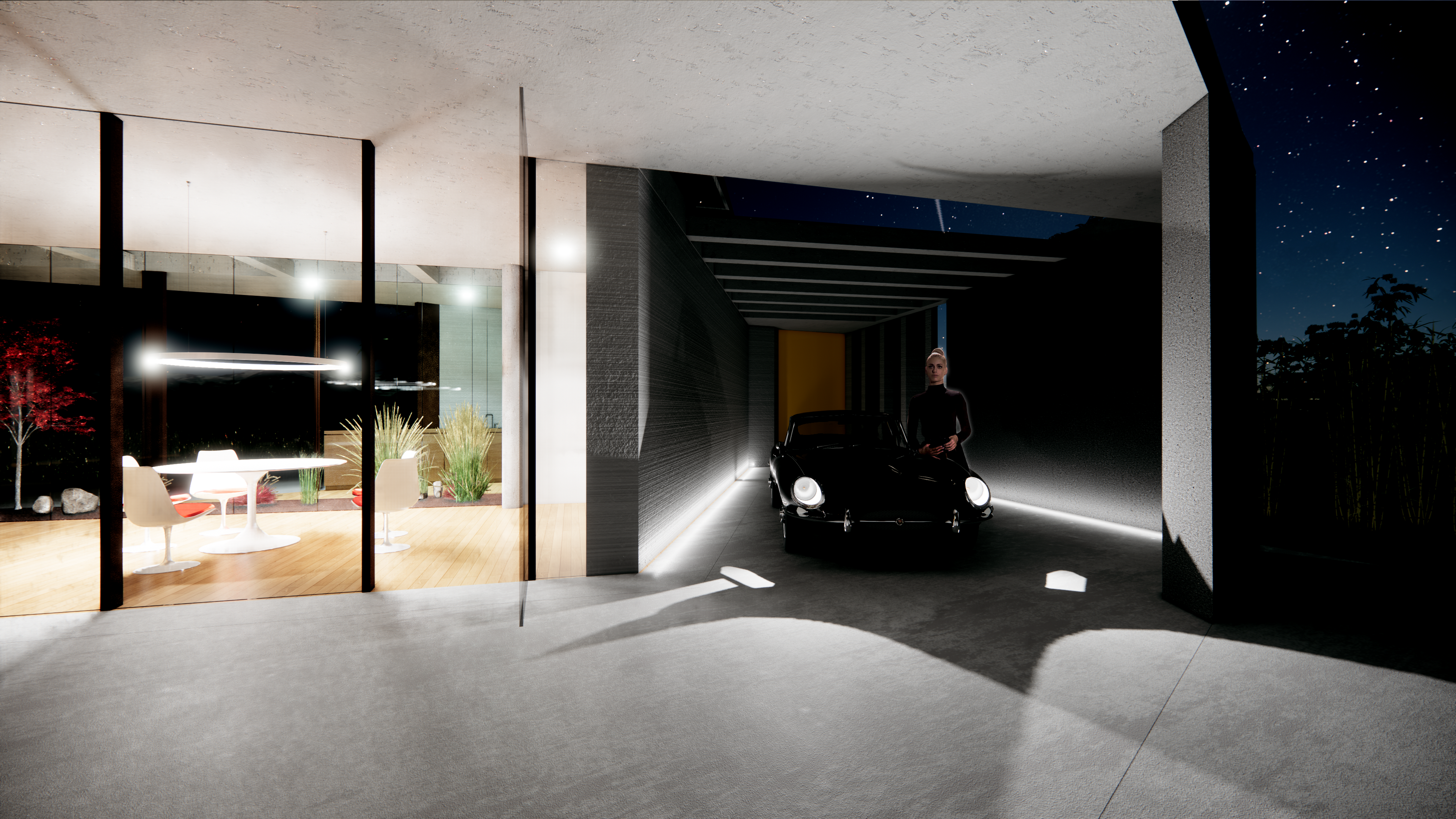 ◦ Quest’ultima, cuore del progetto, vive tra due curve sfalsate, vetrate, che comprimono lo spazio interno per dilatarlo ora verso il paesaggio ora verso il giardino privato della casa.