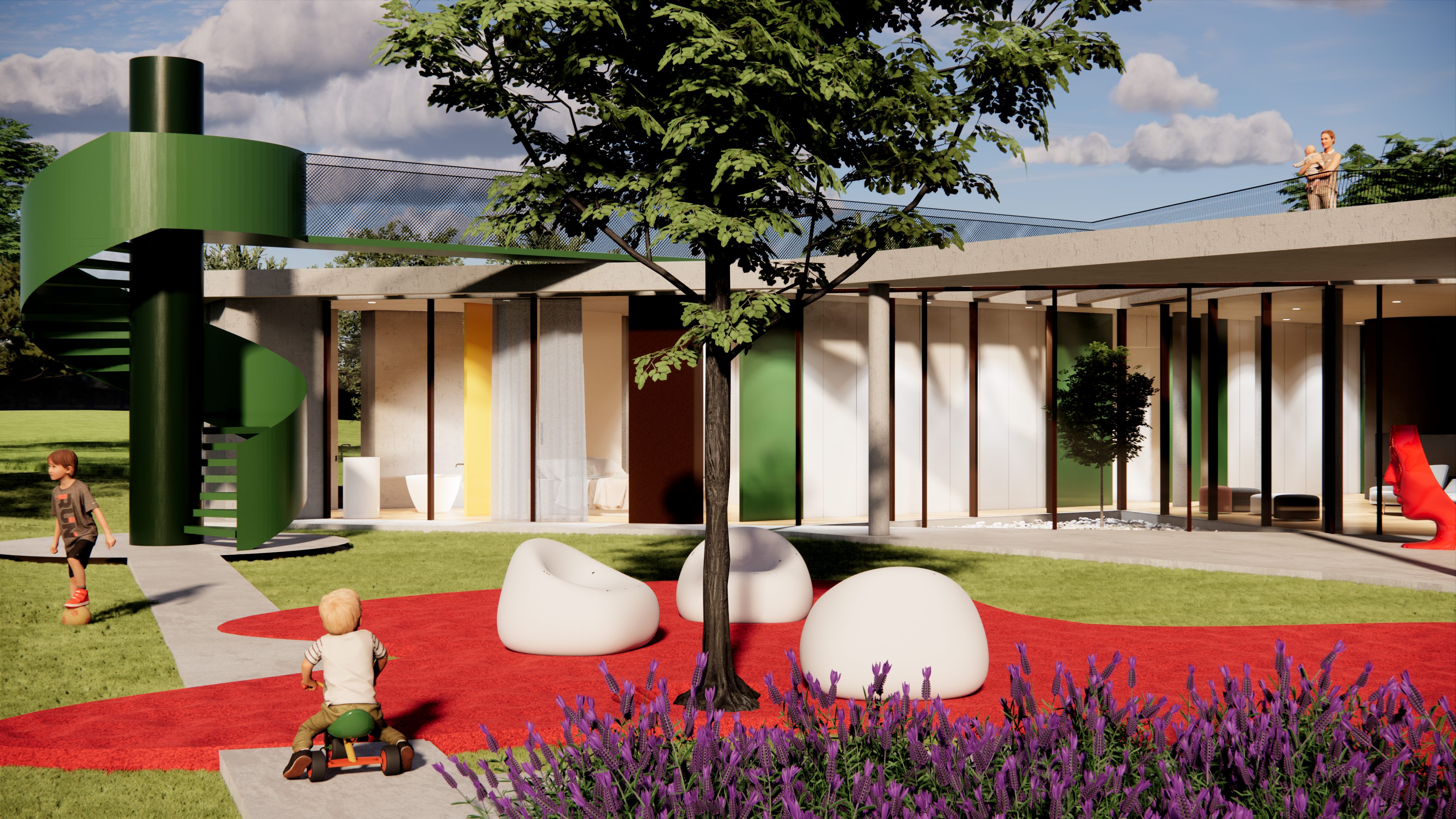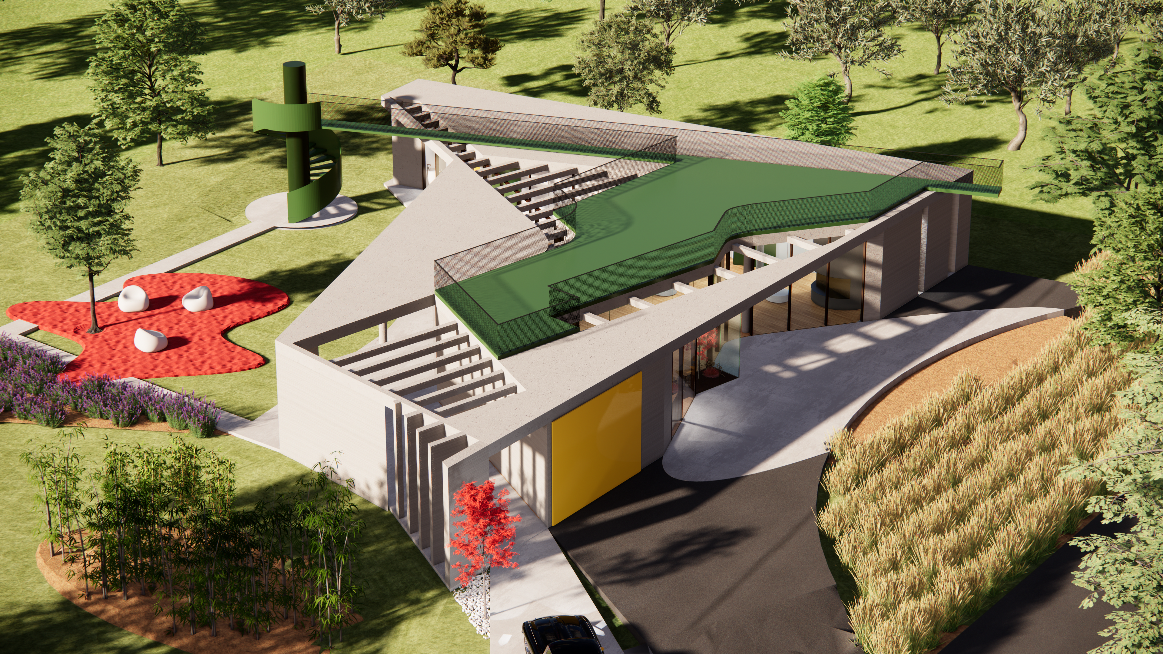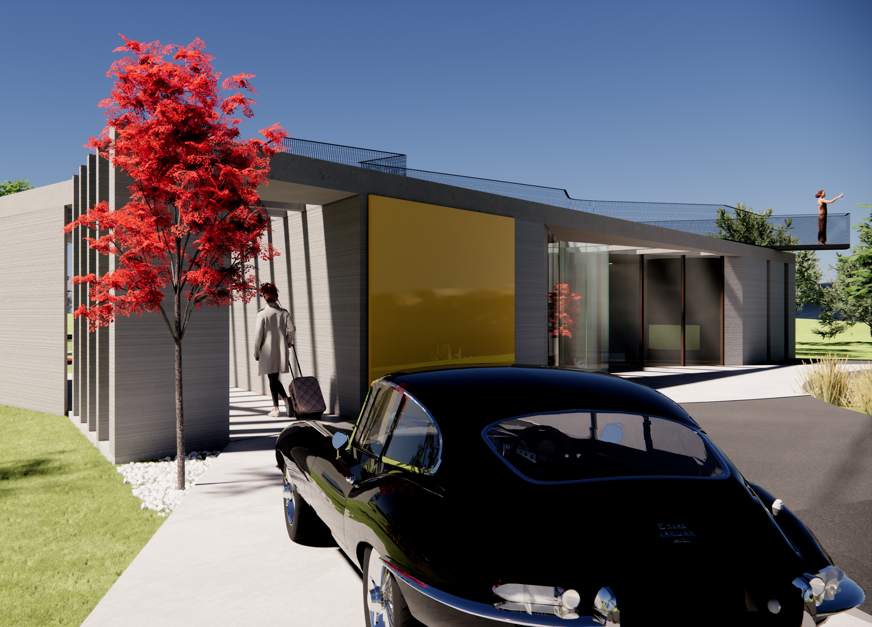 L’abitazione, che si sviluppa su un piano, salva ulteriori viste nel tetto parzialmente praticabile; una rampa posta in una posizione strategica all’interno del lotto conduce al solarium con un percorso privilegiato che porta ad un piccolo sbalzo proprio lungo la direzione panoramica.