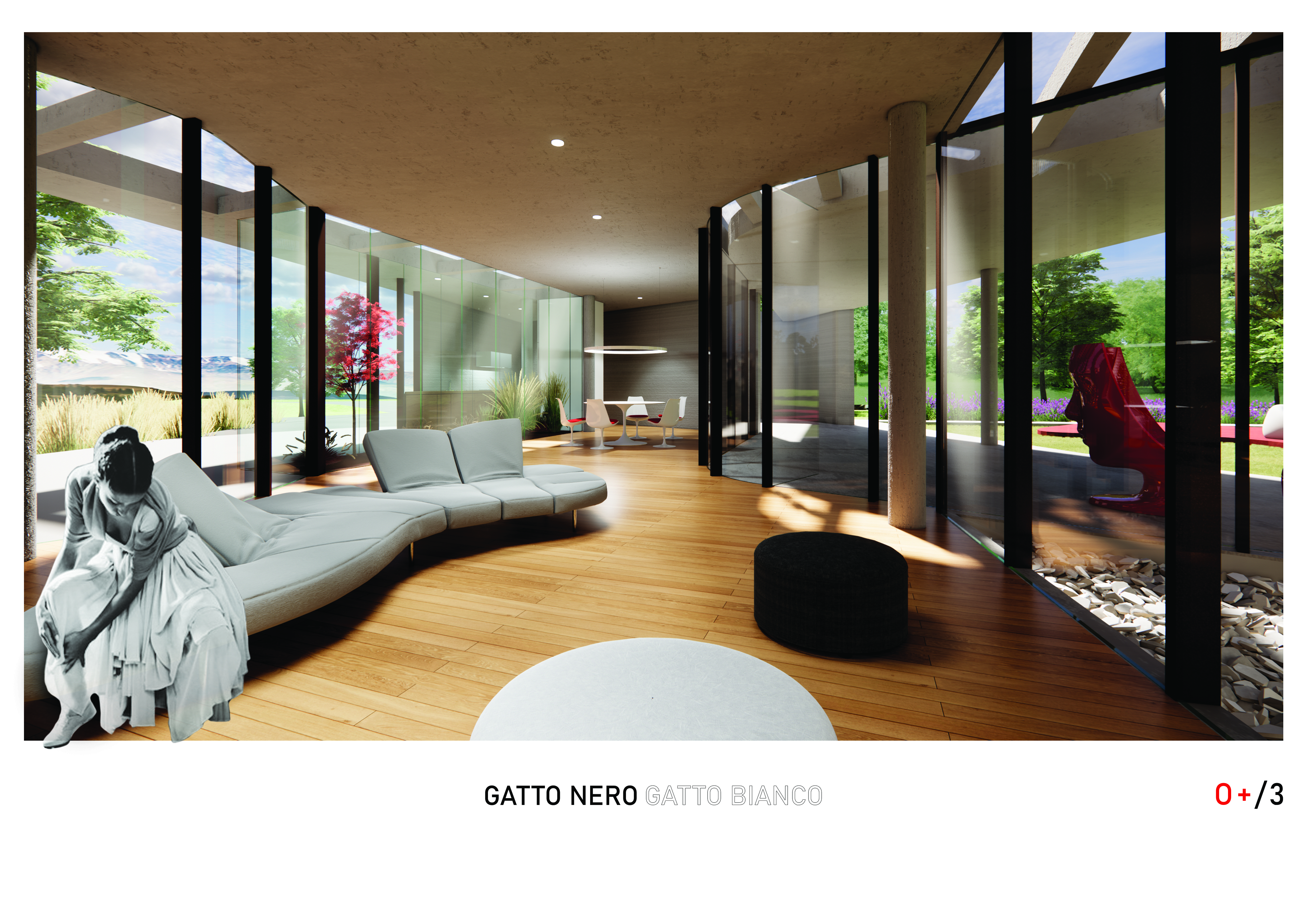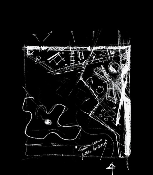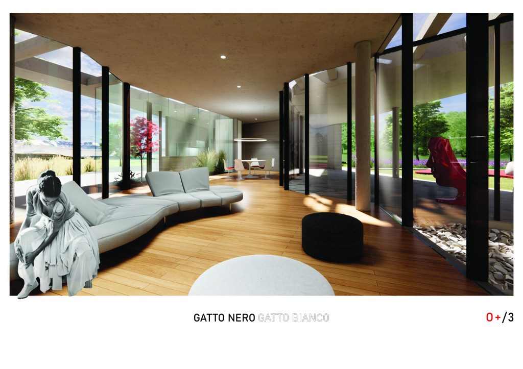 ‘Gatto nero, gatto bianco’ è un’abitazione chiusa ed aperta nel suo sviluppo planimetrico, solida e direttamente attaccata a terra per integrarsi con questa terra d’ulivi tipica e di prestigio della zona del reatino, e dall’altro aperta sul tetto al panorama oltre che alle stelle.