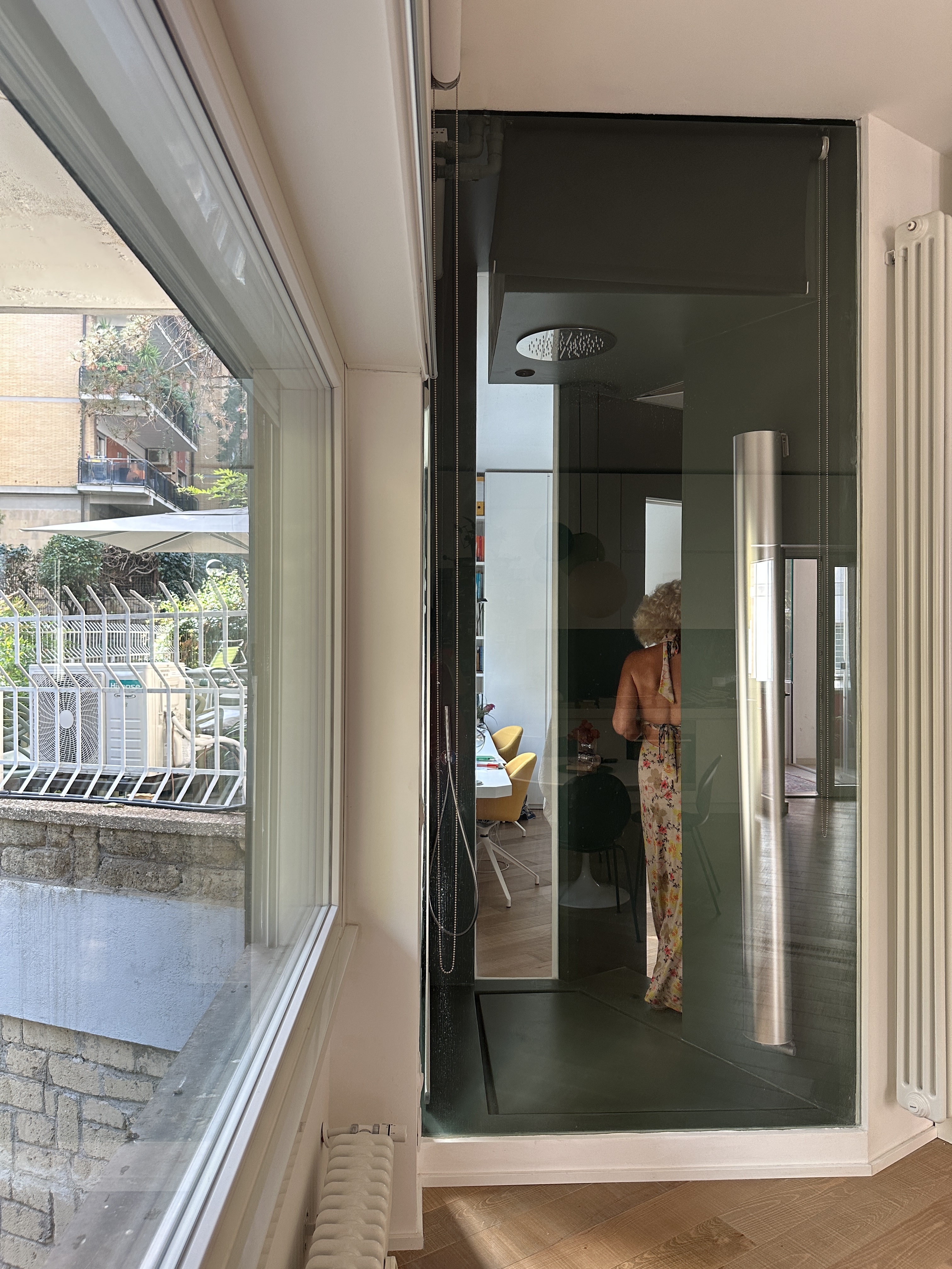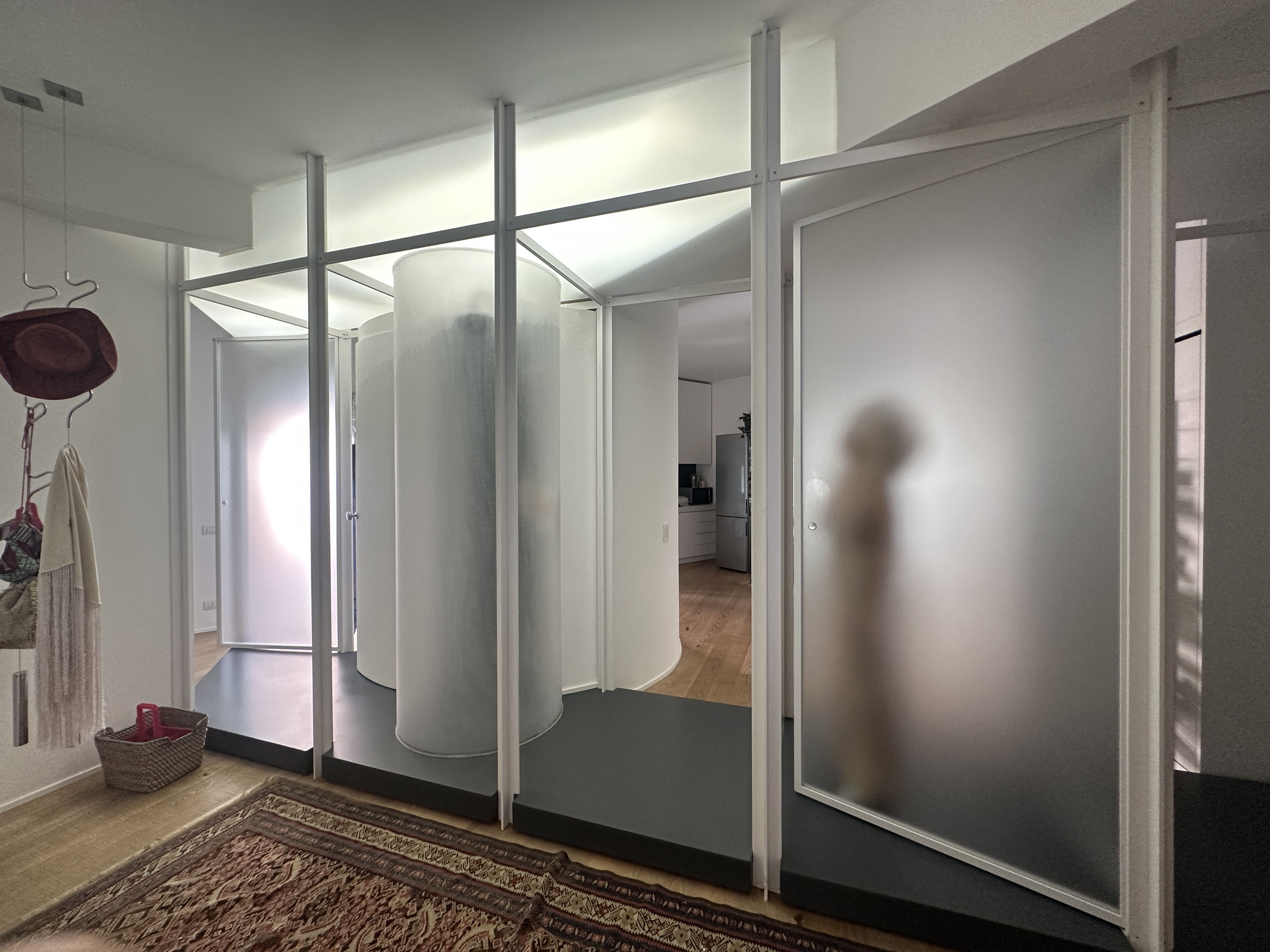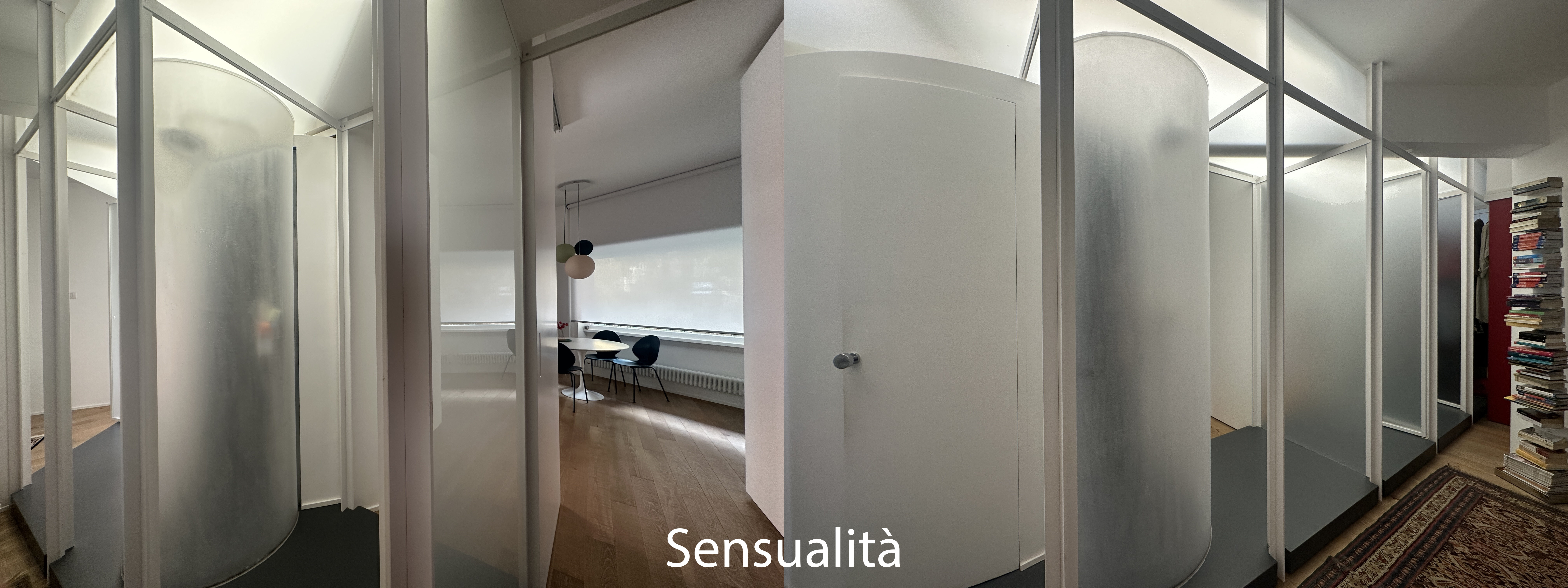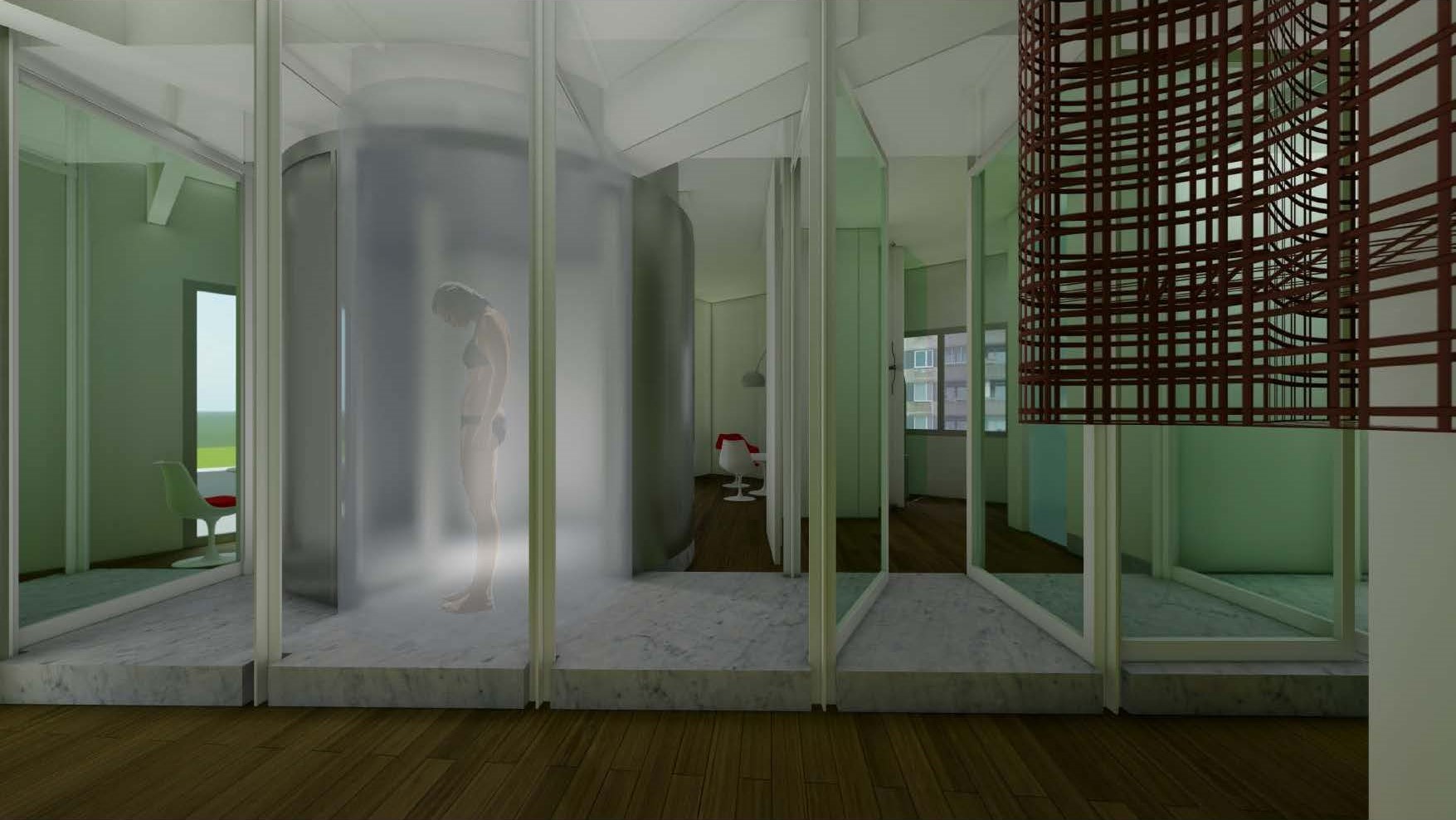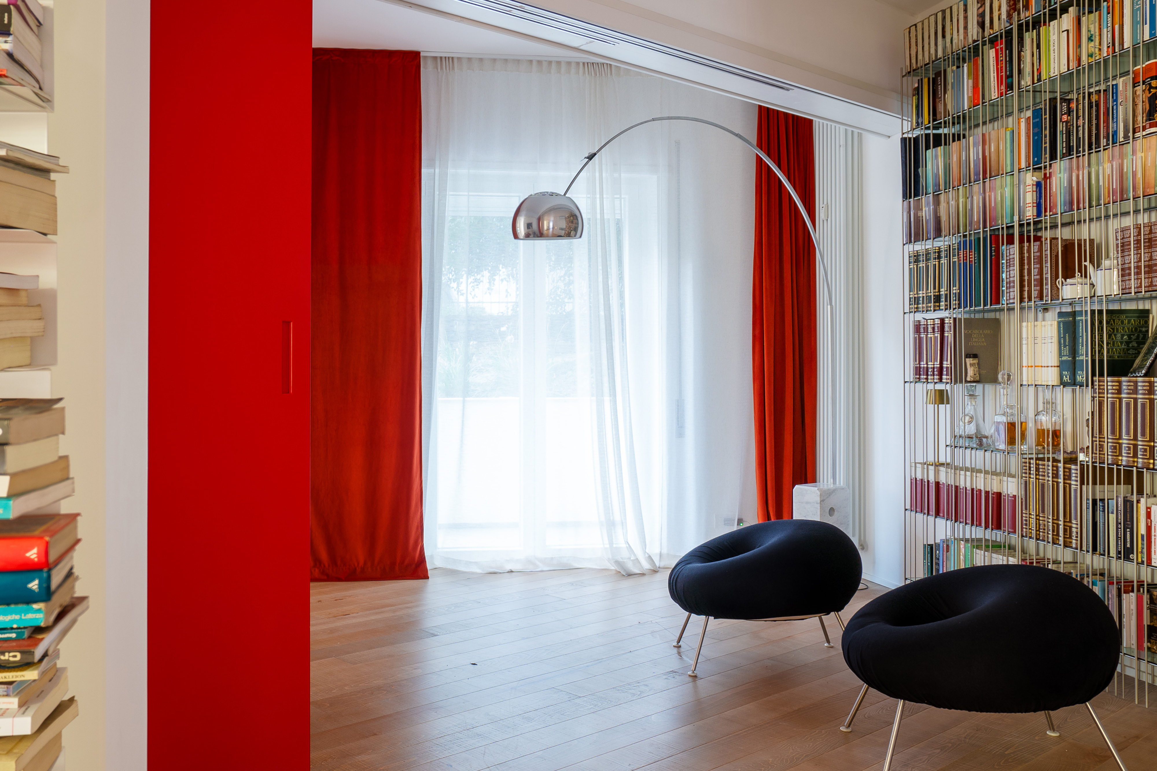In questo, la struttura portante cui far riferimento per definire camere da letto che diventano zona giorno e viceversa è proprio la galleria trasversale, che non si percorre ma si attraversa, cui tutto è addossato e attraversato. I servizi, come le armadiature con letti a ribalta, come i pannelli di legno e in vetro, che dividono e aprono ambienti, si riferiscono ad essa sia a livello funzionale che strutturale ed ideale. Rispetto ad essa tutto muove per invitare il movimento, la scoperta e poi la sosta.