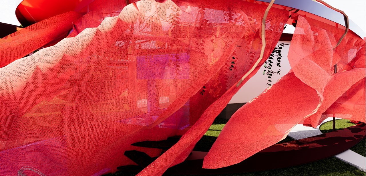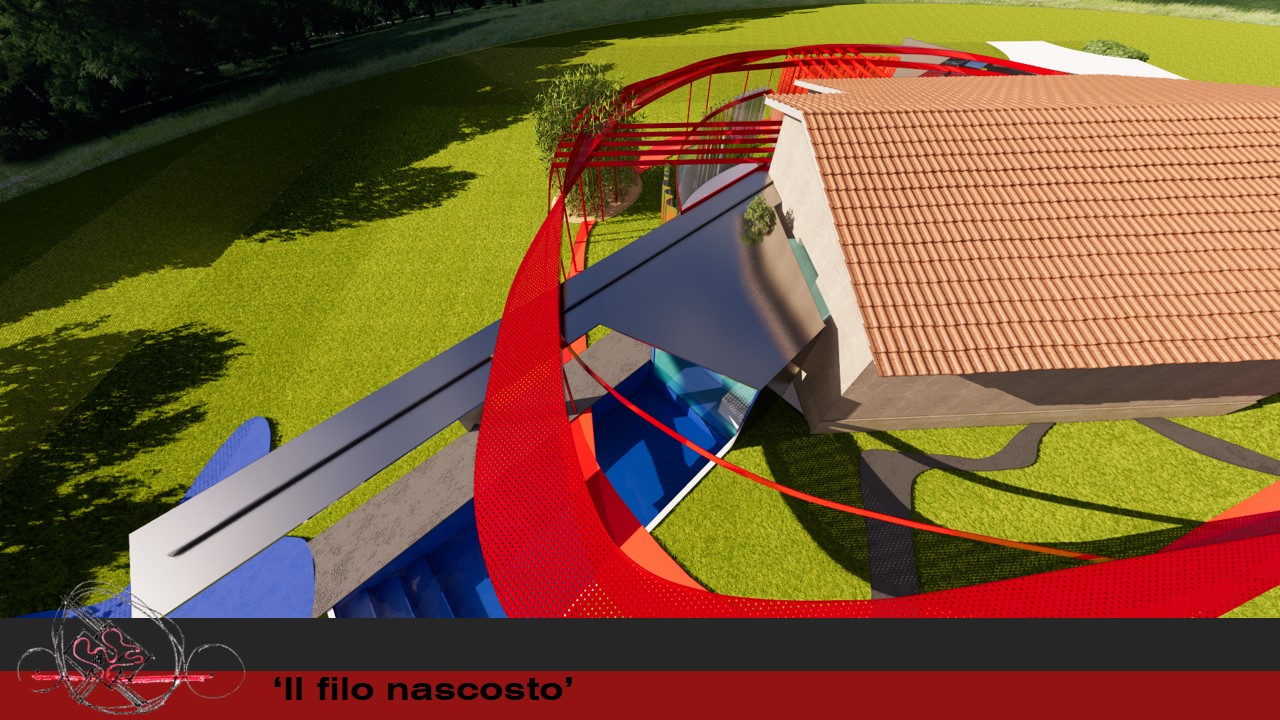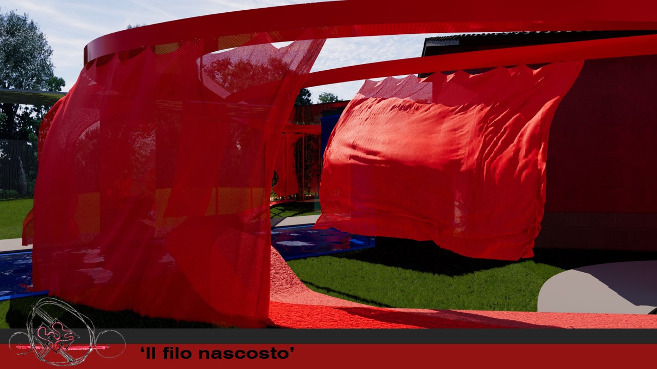Il giro di anelli ammorbiditi da tende che corrono lungo tutto il percorso è attraversato da una pensilina che aggancia la casa e il progetto esterno, in contrasto morfologico e cromatico rispetto alla sinuosa onda data dalle tende al vento.