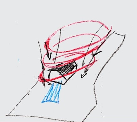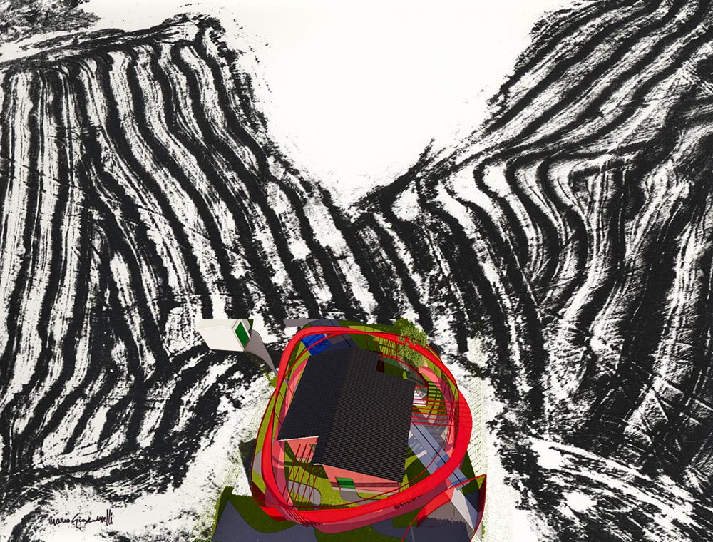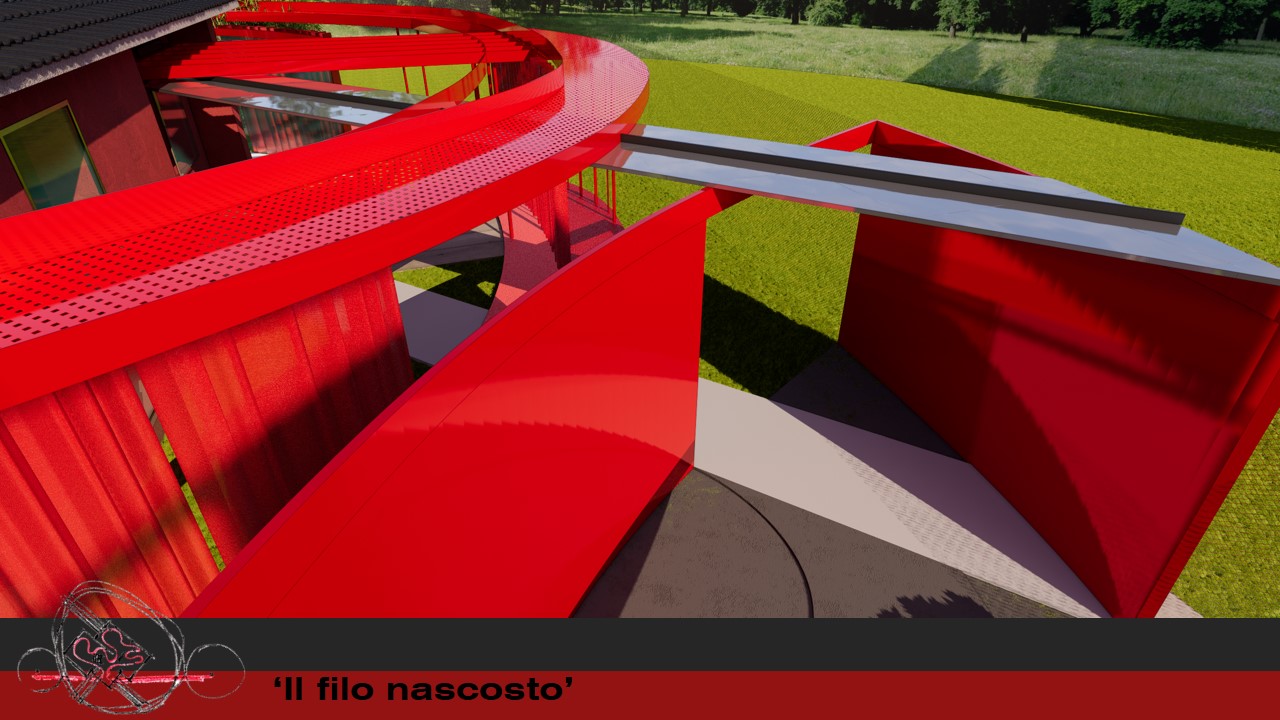 Nel progetto non realizzo una spirale ma scelgo comunque tre linee curve sovrapposte ad anello che danno dinamismo ad una forma comunque racchiusa. E le tende spinte dal vento chiudono ed aprono il paesaggio. Ora lo vedo del tutto, poi velato e dopo ancora aperto del tutto alla vista.