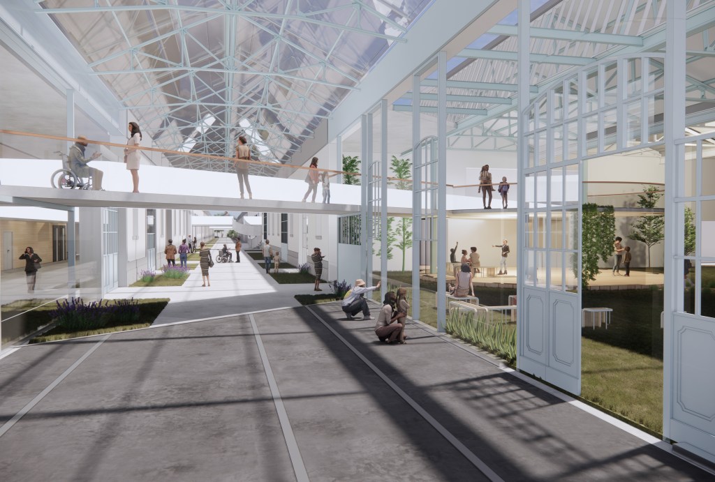 Il recupero e riutilizzo delle facciate su strada, dei pilastri in ferro e delle coperture a shed, sottolineano ulteriormente il concetto di