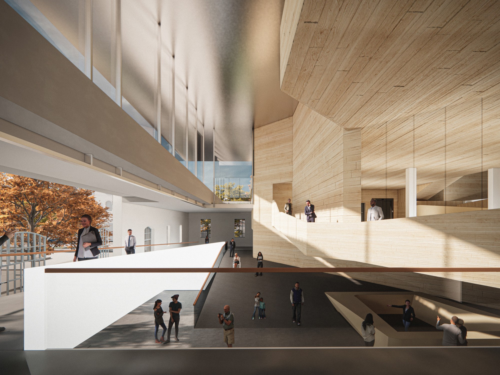 Il suo nocciolo centrale è pensato come un monolite in legno riciclato, scavato per ospitare l’esposizione stabile. Si sviluppa in altezza e i